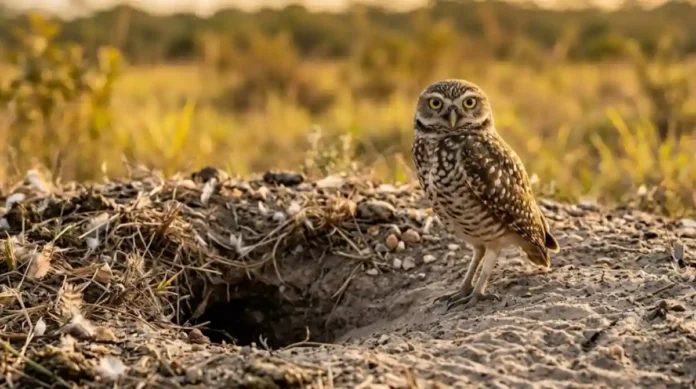 A coruja-buraqueira (Athene cunicularia) quebra quase todas as regras que associamos a essas aves de rapina noturnas. Elas são ativas durante o dia, vivem em áreas abertas e, ao contrário da maioria de seus parentes que nidificam em árvores, preferem a segurança do subsolo. Mas o fato mais surpreendente e verificável sobre esta espécie não é onde ela mora, mas sim como ela “decora” sua casa. Pesquisas ornitológicas consolidadas demonstram que as corujas-buraqueiras coletam e espalham meticulosamente fezes de mamíferos, como gado ou cavalos, ao redor da entrada de seus ninhos, criando um sistema de “pesca” ecológica para atrair besouros e outros insetos coprófagos, que constituem uma parte vital de sua dieta.