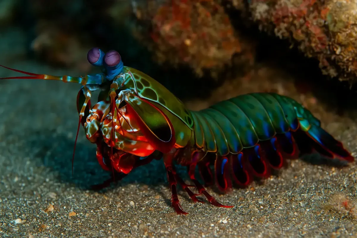 A brutalidade do camarão-louva-a-deus-palhaço é equilibrada por uma visão que está entre as mais sofisticadas do reino animal. Ele enxerga polarizações de luz e possui até 16 tipos diferentes de receptores de cor, comparados aos nossos três. Isso significa que ele pode ver nuances invisíveis aos nossos olhos, incluindo luz ultravioleta.