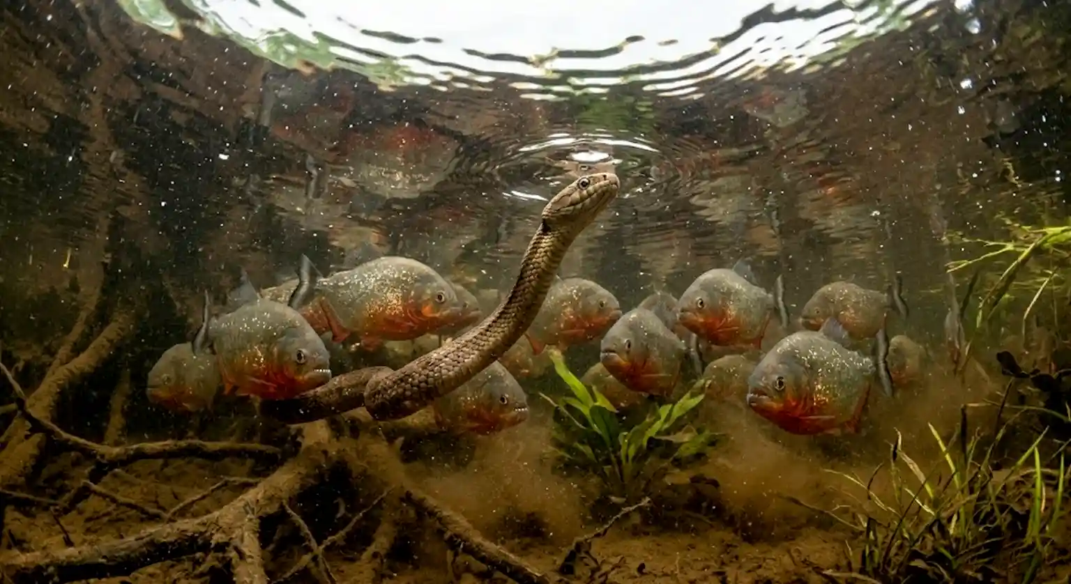 Diferente de outros predadores que evitam áreas de alta densidade de piranhas, as serpentes aquáticas do gênero Helicops utilizam esses mesmos nichos para caçar com eficiência cirúrgica.