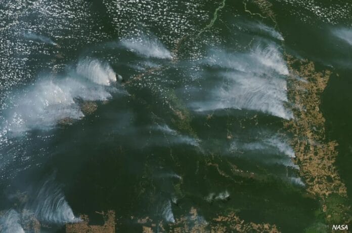 Imagens divulgadas pela NASA na segunda-feira, 12 de agosto, revelaram vastas colunas de fumaça provenientes de incêndios florestais na Amazônia. A fotografia, capturada em 4 de agosto por um satélite da agência espacial dos EUA, o mesmo utilizado pelo Brasil para monitorar incêndios, mostra focos de fogo em estados como Pará e Amazonas, sendo que este último tem 22 municípios afetados pela fumaça, incluindo a capital, Manaus.