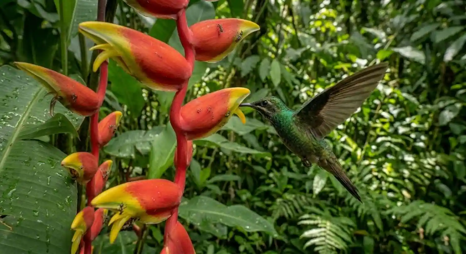 Para manter o seu voo parado no ar, um beija-flor precisa consumir diariamente uma quantidade de néctar que equivale a até oito vezes o seu próprio peso corporal. Esse metabolismo acelerado faz dele um dos animais mais vorazes da natureza em termos proporcionais. Sem o néctar das helicônias, essas pequenas aves entrariam em colapso energético em poucas horas, o que ressalta a importância vital da preservação dos microhabitats úmidos da Amazônia.