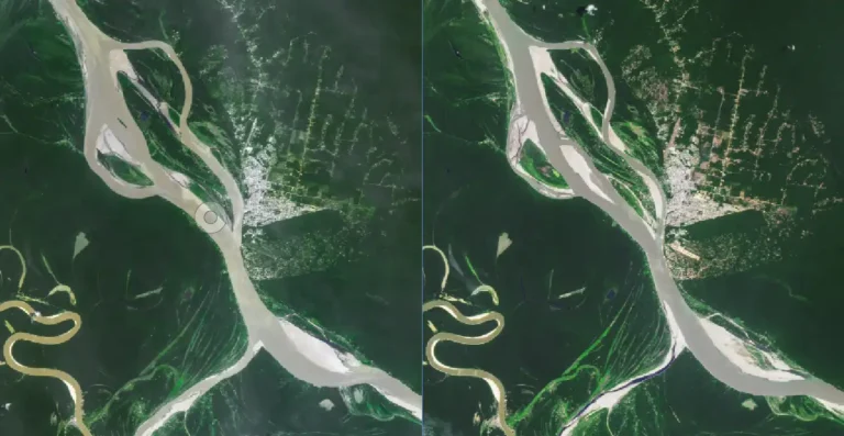Este par de imagens Landsat ilustra o encolhimento do Rio Solimões perto de Tabatinga, uma cidade brasileira no oeste do Amazonas, perto da fronteira com o Peru e a Colômbia. A imagem acima (à direita) foi capturada pelo Operational Land Imager-2 (OLI-2) em 21 de setembro de 2024. A outra imagem (à esquerda) mostra a mesma área em 21 de setembro de 2021, quando os níveis de água estavam mais próximos do normal.