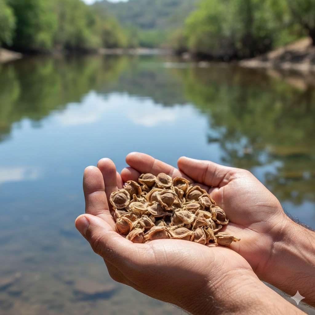 É aqui que entra a magia da natureza amazônica e tropical. A semente da moringa funciona como um “ímã natural”. Enquanto o plástico tenta se esconder, as proteínas da planta — que possuem carga positiva — buscam essas partículas, neutralizam sua força e as obrigam a se unir. É um processo que transforma o invisível em algo sólido e fácil de retirar.