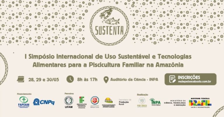 Nos dias 28, 29 e 30 de maio, o Instituto Nacional de Pesquisas da Amazônia (Inpa/MCTI) e instituições parceiras realizarão o I Seminário Internacional de Uso Sustentável e Tecnologias Alimentares para a Piscicultura Familiar na Amazônia (Sustenta). O evento acontecerá no Auditório da Ciência do Inpa, das 8h às 17h, e reunirá especialistas da Amazônia brasileira, peruana, colombiana e boliviana para discutir inovações e soluções sustentáveis para a piscicultura.