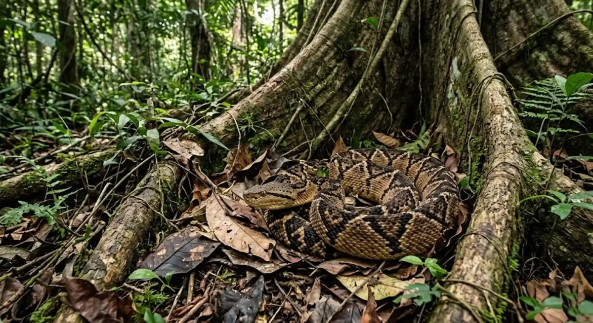 BOX: O Segredo da Cauda Vibratória | Embora não possua o guizo característico das cascavéis, a surucucu-pico-de-jaca apresenta um comportamento curioso de defesa. Quando se sente ameaçada, ela vibra a ponta da cauda com vigor contra as folhas secas no chão da mata. Esse movimento produz um som seco e constante que serve como um aviso sonoro para intrusos. É a forma elegante e eficiente que a natureza encontrou para evitar conflitos desnecessários no ambiente selvagem.